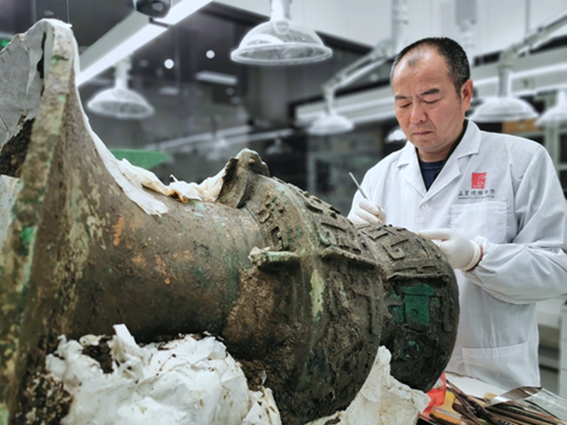 三星堆博物馆陈列保管部副部长郭汉中在三星堆博物馆文物保护和修复中心清理大口尊(2022年3月摄,资料照片)。新华社发