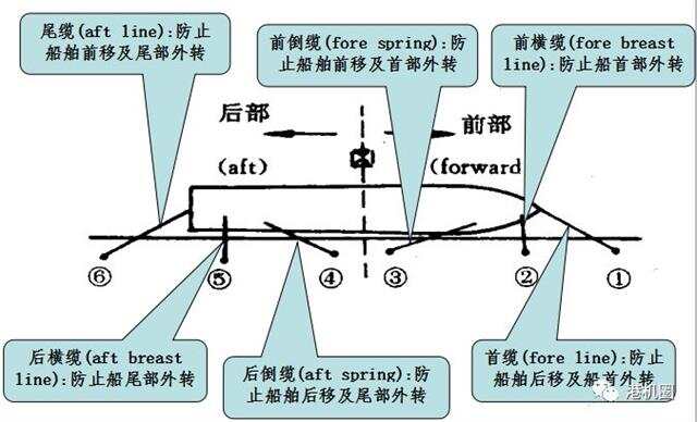在流水港或风较强的静水港,船舶通常采用顶流顶风靠泊,为阻止船身后移,只要一停车,船身就会水流或风力作用而后退,此时一般是先带艏缆、前倒缆、前横缆, 然后再带后倒缆、艉缆、后横缆。