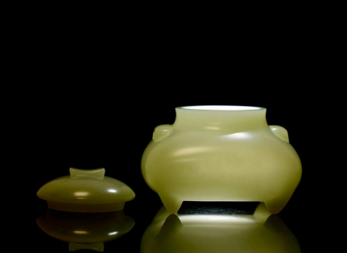 作品侧面起伏的轮廓线尤为引人注目,聂子翔称之为“势能雕刻法”:“和田玉的肌理自带气韵流动,那些被常人忽视的料形起伏、颜色过渡,恰恰是雕刻师应该追随的天然轨迹。”在《观沧海》中,他巧妙利用玉料原生的弧度,通过深浅浮雕交替呈现雪落甲胄的动势,使静态玉石产生风雪席卷的时空张力。这种创作理念与95料的特性深度契合。该玉种特有的青白基底如覆霜戈壁,交错分布的钉纹恰似雪落轨迹。聂子翔通过三个月反复琢磨,最终确定“以瑕为瑜”的方案:“当钉纹被雕琢成立体雪花,那些原本割裂的白色斑点,反而成为贯穿作品的视觉韵律。”